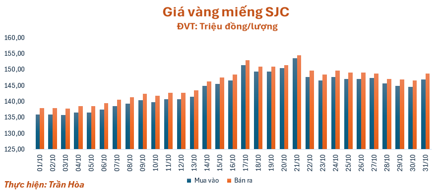 Đỉnh điểm được ghi nhận ngày 21/10, khi vàng SJC vọt lên 153,9 triệu đồng/lượng, theo sau là cú “rơi tự do” xuống khoảng 147 triệu đồng/lượng cuối tháng.