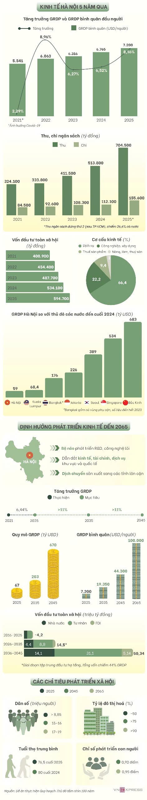 Hà Nội lên kế hoạch duy trì tăng trưởng hai chữ số trong 2 thập kỷ tới, với mục tiêu GRDP bình quân đạt 44.300 USD vào 2045 - gấp hơn 6 lần hiện tại.