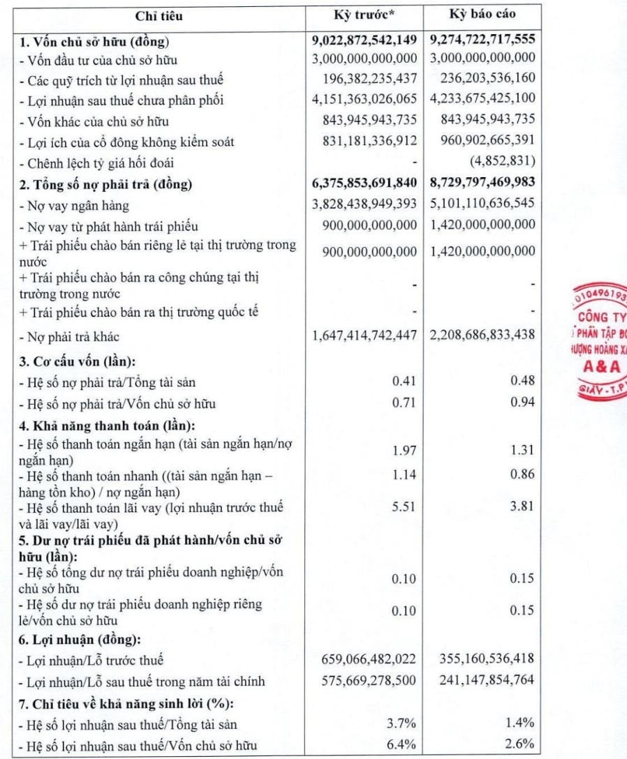 Tỷ lệ nợ phải trả/vốn chủ sở hữu đã tăng từ 0,71 lần lên 0,94 lần, trong khi hệ số thanh toán ngắn hạn giảm mạnh từ 1,97 xuống 1,31 lần – dấu hiệu cho thấy khả năng thanh toán của doanh nghiệp suy yếu.