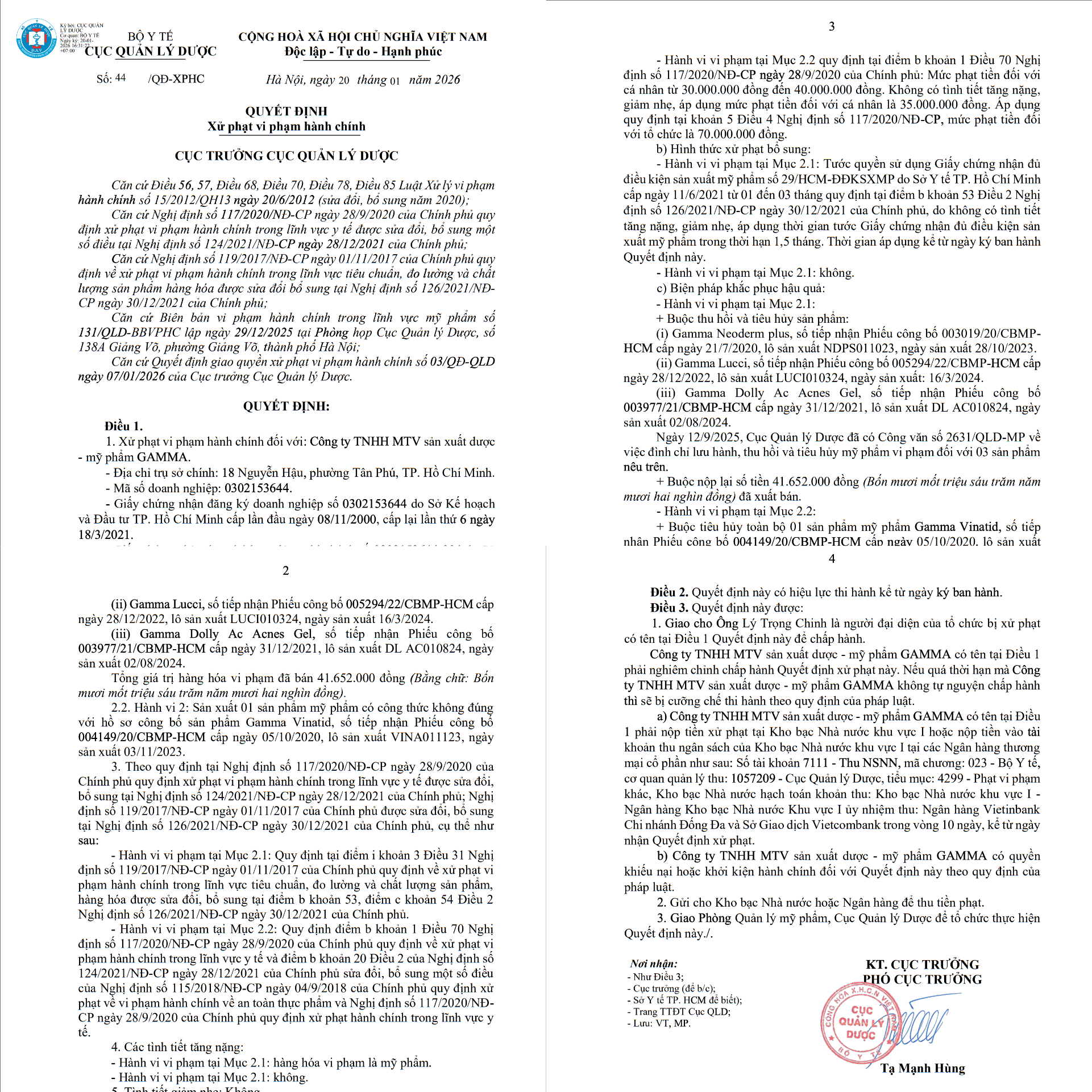 ⚠️ Tước quyền sử dụng Giấy chứng nhận đủ điều kiện sản xuất mỹ phẩm 1,5 tháng